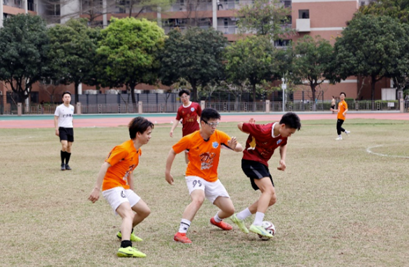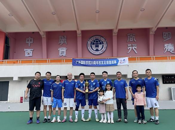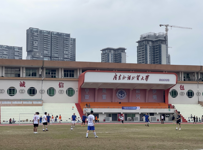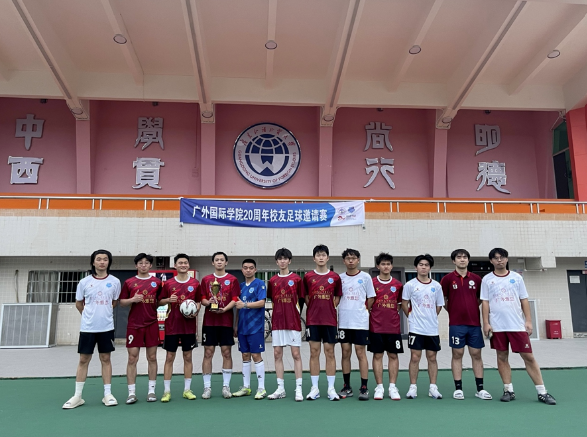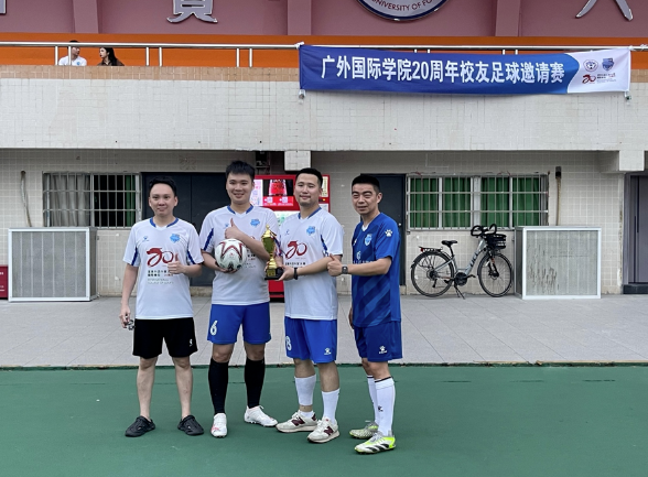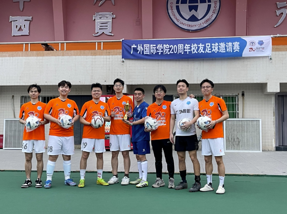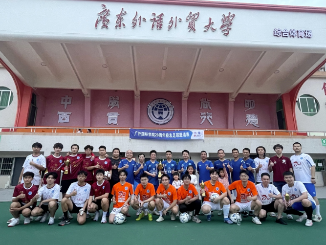 近日,乘广外国际学院建院20周年之机,校友足球邀请赛首场比赛在学校足球场举行,由各级校友组成的队伍对战教工队和在校生队分别着橙、白、红、蓝四色球衣,采取八人制两两比赛。