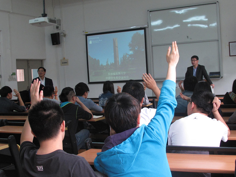 本网讯2015年03月23日(周一)上午,美国乔治福克斯大学副校长彭博士、驻湖北办公室主任蒋飞来访国际学院。与国际学院(主持工作)副院长魏辉良、副院长刘明进行会谈,会后与13级乔治福克斯项目学生会面,对于该项目的学生2015年最新的申请要求作出了详细的讲解。