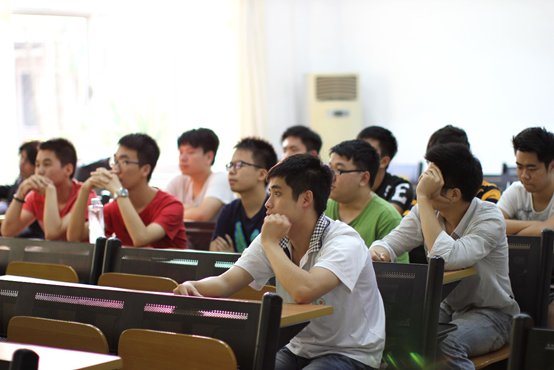 现场同学认真投入地听讲,不时向教授提问。教授与学生相互配合,气氛时而严肃安静、时而轻松活泼。