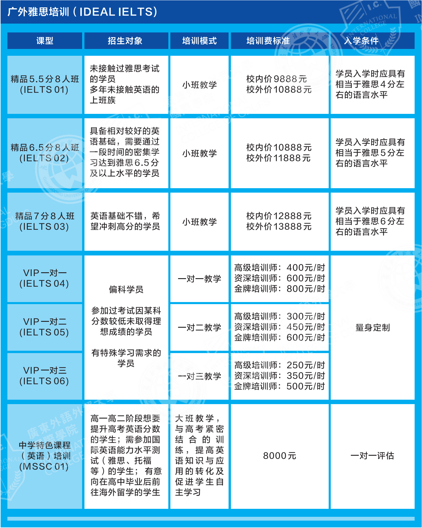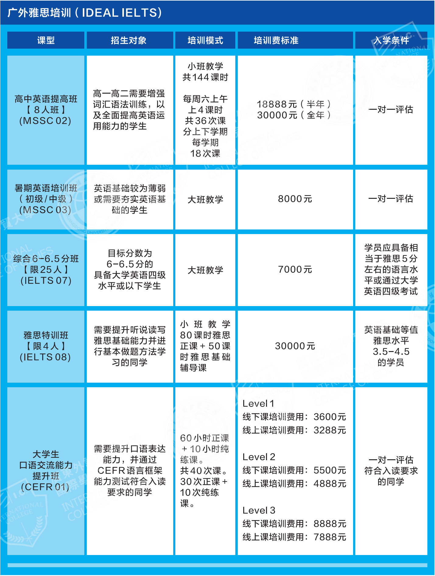 广外国际学院于2015年成立广外留学语言培训中心,面向社会招生,为有留学需求的学员提供语言培训,包括面向英语国家留学的雅思考试培训,面向韩国留学的韩语等级考试培训,面向日本、西班牙留学的日语、西班牙语等级考试培训等。迄今为止广外雅思培训已招收超过3000名学生,帮助他们实现雅思考试成绩突破;韩语培训超过1000名学生,帮助他们顺利录取韩国汉阳大学、中央大学等韩国名校;日语和西班牙语培训分别超过100和30名学生,帮助他们顺利实现日本、西班牙大学本科课程录取。