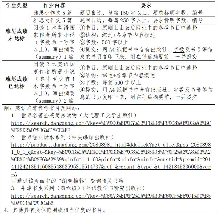 2018级(一年级)学生必须完成的作业:作文(雅思成绩达标者无此要求)+ 读书摘要,具体要求见附表。