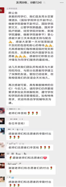 副书记和辅导员郭文文迅速组织相关学院负责老师、入党积极分子、学生骨干、外国留学生等担任志愿者,建立起抗疫服务队,为居住在友苑B区包括国际学院在内13个学校教学单位的近971名学生提供生活保障。抗疫服务队承担起整个友苑B区一日四餐配送、核酸检测、保障生活物资、应急医疗、紧急快递收取等服务。