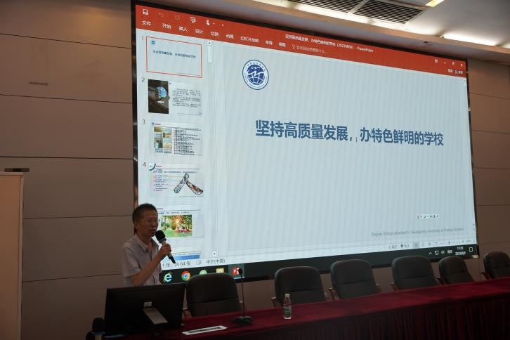 会上,广州市实验外语学校校长万清华对调研一行表示热烈的欢迎。然后,就学校办学理念和国际化办学成果进行详细分享。以“坚持高质量发展,办特色鲜明的学校”为主题,与调研学员进行深入的互动交流。
