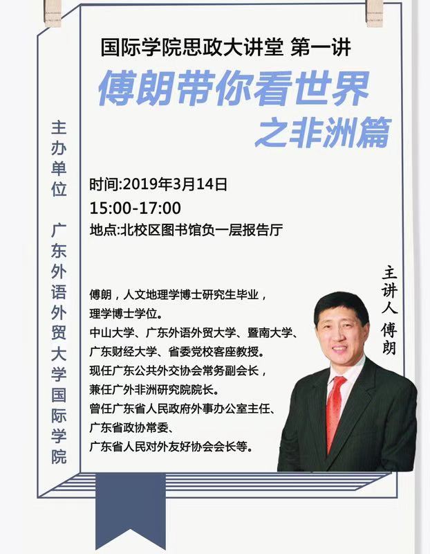 第一讲,学院邀请到傅朗主任为我们作“傅朗带你看世界——非洲篇”专题讲座,讲座时间为2019年3月14日15:00-17:00,地点在北校区图书馆负一层报告厅,欢迎有兴趣的同学前来参加。