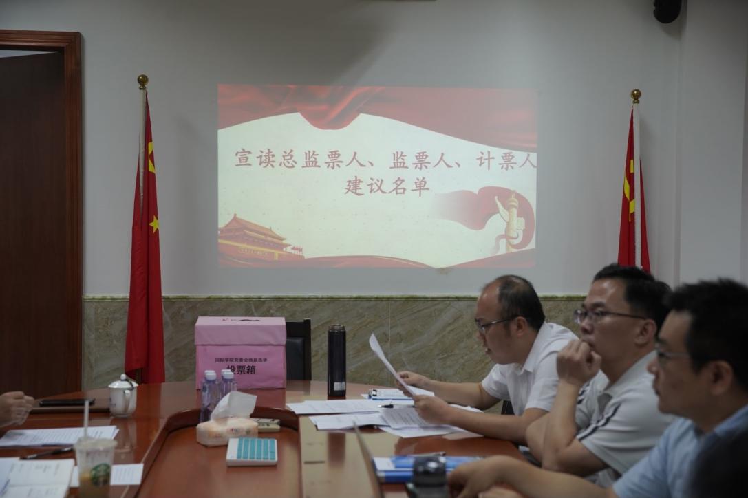 随后,国际学院副院长(主持工作)刘田苗同志宣读了学校党委《关于国际学院党委换届候选人预备人选的批复》和国际学院新一届党委候选人简介,国际学院党委副书记陈静同志宣读《中共广东外语外贸大学国际学院委员会选举办法(草案)》以及监票人建议名单,获全体党员一致通过,投票环节正式开始。