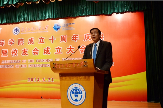 十分高兴,也十分荣幸应邀出席今天的活动,和新朋老友欢聚一堂,共同庆祝广东外语外贸大学国际学院成立十周年。首先,请允许我代表教育部留学服务中心借此广东外语外贸大学国际学院成立十周年暨校友会成立之际,向广东外语外贸大学表示热烈祝贺!向国际学院全体教职员工和各位校友表示祝贺和诚挚问候!