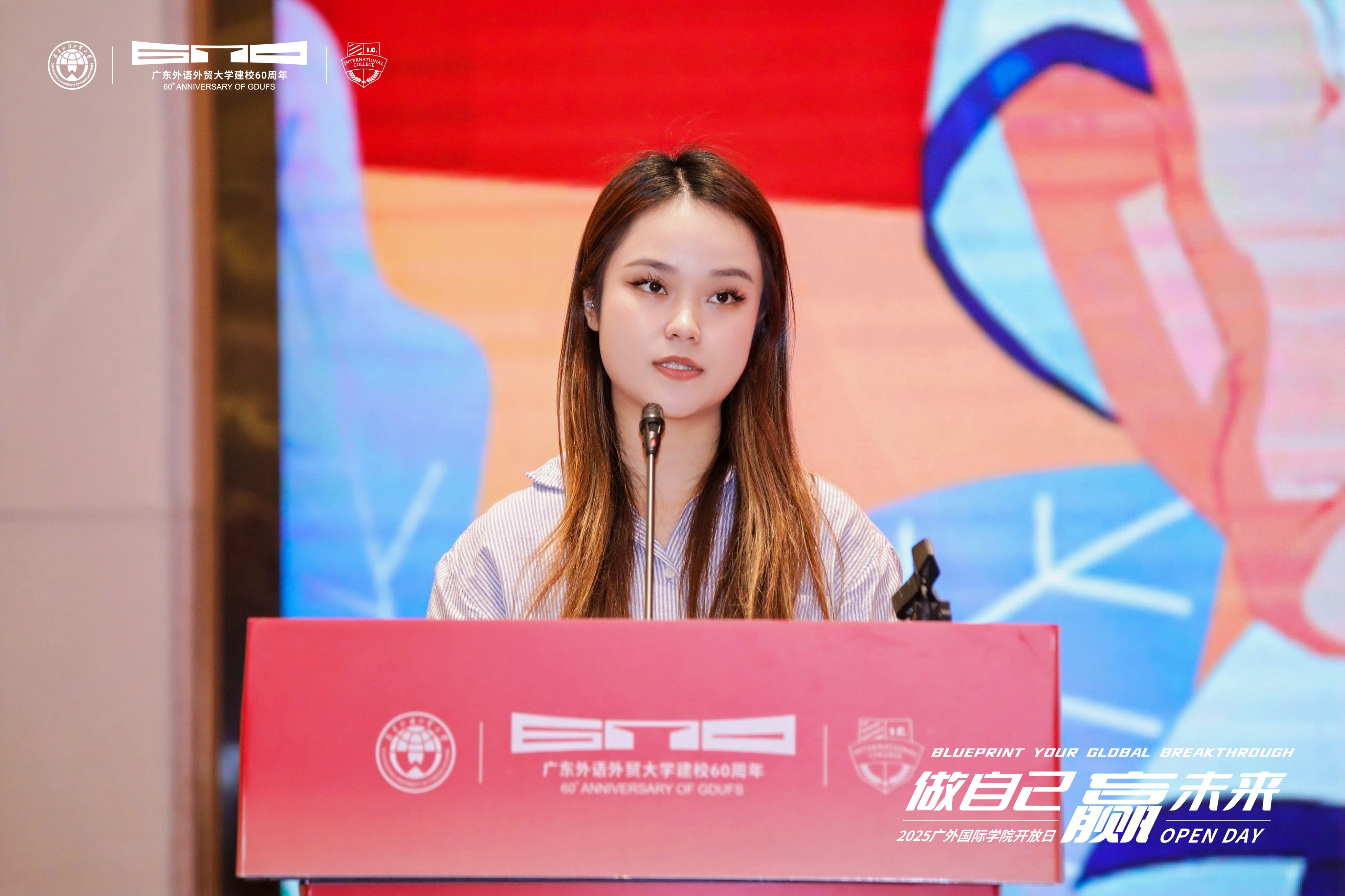 2023级体育管理专业孙玙洋表示,面对英语基础薄弱和专业跨学科的挑战,他通过学院系统的语言培训和注重实践的体育管理课程实现逆袭,连续两年荣获学院一等奖学金。2024级平面设计专业黎博森家长梁树果女士表示,要尊重孩子自主选择留学路径,实现从“要我学”转向“我要学”的蜕变。2018届校友卢珏君以“破圈者”身份讲述逆袭历程,用亲身经历印证国际化教育价值。“广外2+2项目是我的敲门砖。热爱是最好的指南针,选择也远比天赋更重要。”