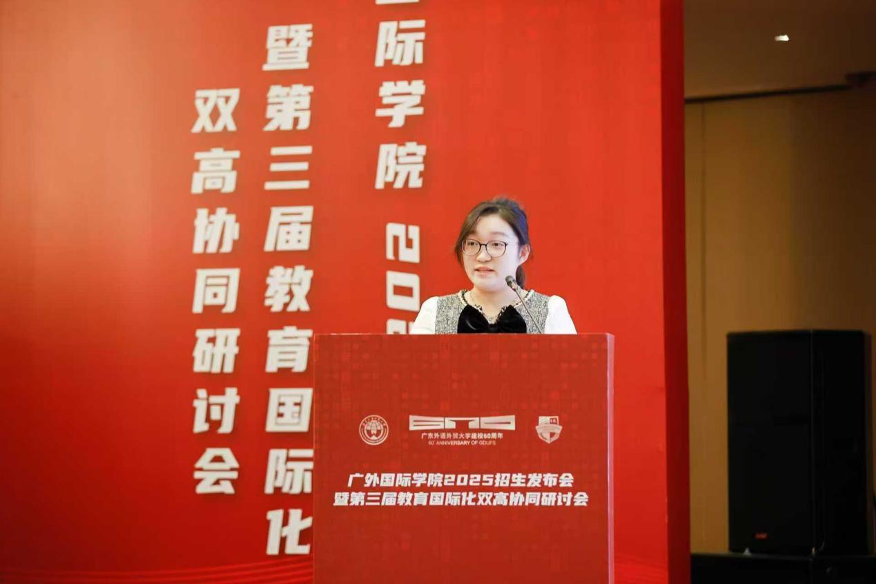 在读学子代表澳新商科2303刘子莹对学院的培养表示了感谢,并从专业课、英语课和校园活动等方面分享了在学院学习的感受。英国兰开夏项目校友代表古璇以“做自己,赢未来”为主题,回顾了自身从广外国际学院学子到企业家的成长经历。