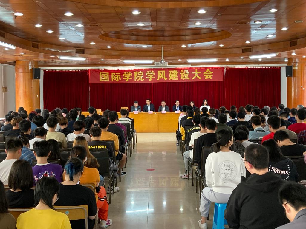 3月10日晚上和11日下午,国际学院学风建设大会在南北校区分别召开。大学原副校长、学院办学督导陈林汉教授,学院全体领导班子和全体班主任老师出席大会,2019级、2020级在读学生参加大会。大学原副校长、学院办学督导陈林汉教授出席会议并讲话,学院院长梁学宏作学风建设专题讲话。北校区由学院党总支书记钟罗军主持会议,南校区由学院党总支副书记沈冬苗主持会议。